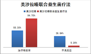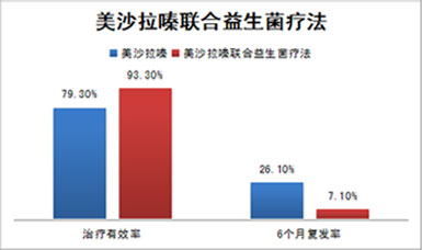 研究結(jié)論:在輕中度潰瘍性結(jié)腸炎治療中,聯(lián)合應(yīng)用美沙拉嗪和益生菌比單用美沙拉嗪治療臨床療效好,并有效預(yù)防復(fù)發(fā)。